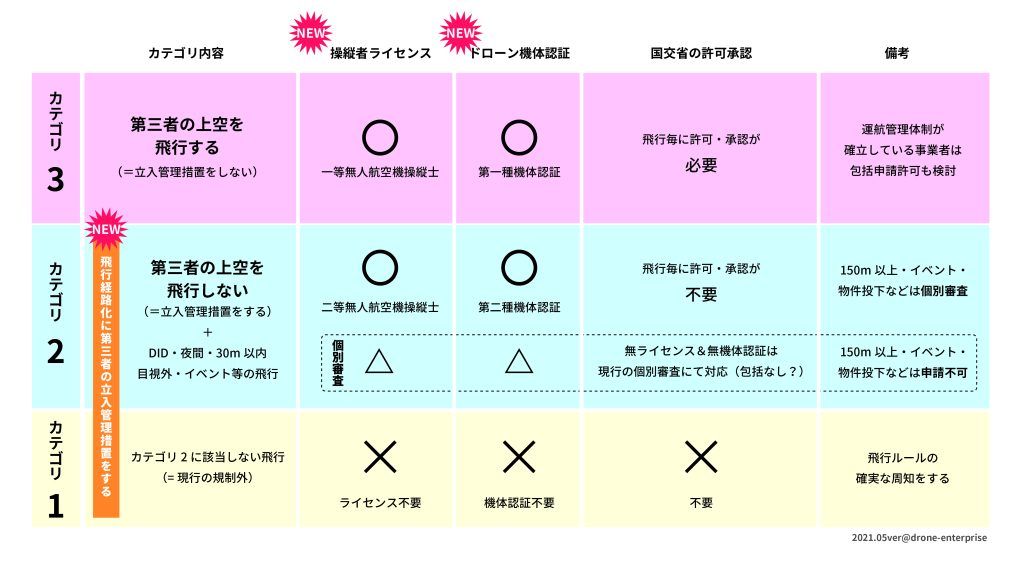 特にカテゴリ2では、現行のドローン制度に似ており、包括申請のように一定の許可を得るのと同様に操縦者ライセンスがあれば許可が不要になるそうです!