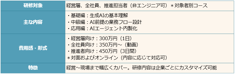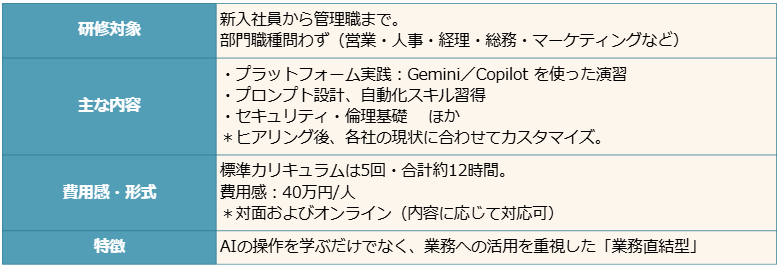 そうした背景から、AI研修を提供する企業が増えており、導入にあたっては厚生労働省の『人材開発支援助成金』を活用できる場合もあります。ニーズは今後ますます高まりそうですね。